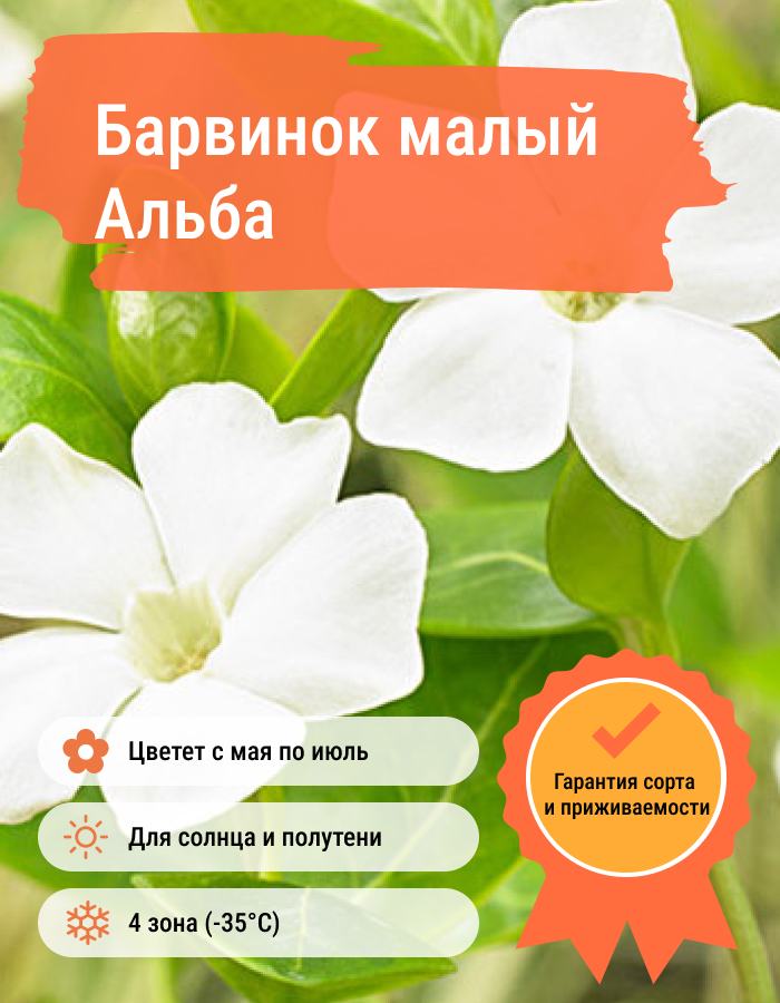 Рассада барвинка «Альба» (Alba) хорошо разрастается в любых условиях, как при ярком солнце, так и в полностью затененных местах. К почве растение также не требовательно, но лучше всего растет в плодородном и рыхлом грунте. Рассада барвинка «Альба» используется для создания рокариев, клуб и создания лужаек в парках и скверах. Веточки могут достигать в длину до 60 см. Они плотно покрыты продолговатыми листочками темно-зеленого цвета. Листики сохраняют цвет круглый год. Растение, выращенное из семян барвинка «Альба», зацветают в мае. Цветение продолжается на протяжении месяца. Цветочки имеют белый цвет.