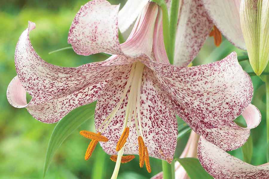 Окраска цветка : грациозные цветы белоснежного оттенка с густым малиновым крапом по нежным, слегка закрученным лепесткам