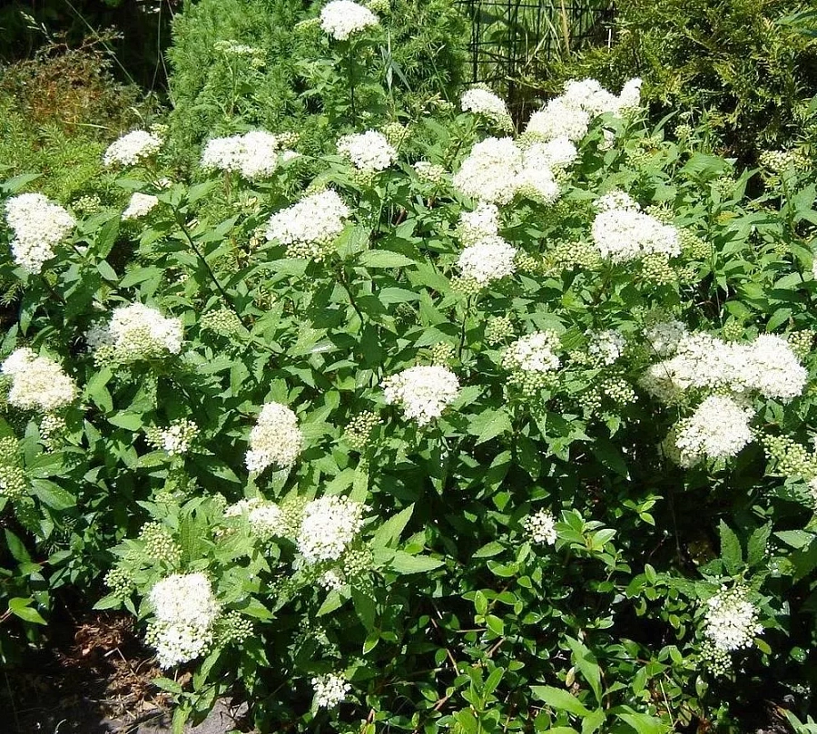 Неприхотливые саженцы спиреи Альбифлора будут отлично смотреться в сочетании с хвойными кустарниками и спиреями другой расцветки.