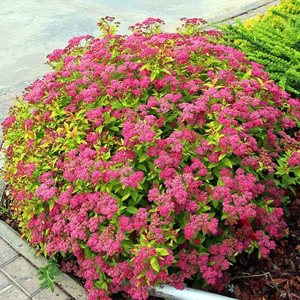Саженцы японской спиреи Антони Ватерер (Anthony Waterer) порадуют садоводов яркими соцветиями, которые контрастно выделяются на фоне темной сочной листвы. Этот пышный кустарник отлично сочетается с более высокими растениями и гармонично впишется в группу себе подобных представителей флоры.