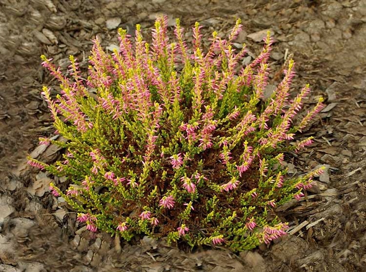 Саженцы вереска обыкновенного Тереса (Theresa) вырастают в раскидистый кустик, высотой 40 и шириной 65 сантиметров. Желто-зеленые шиловидные листочки напоминают формой хвою и такие же вечнозеленые. В сентябре скромная маленькая «елочка» преображается, покрываясь множеством светло-розово-сиреневых бутонов. Особенность сорта Тереса в сохранении цветком нераскрытой формы в течение всего цветения, что придает особую прелесть растению.